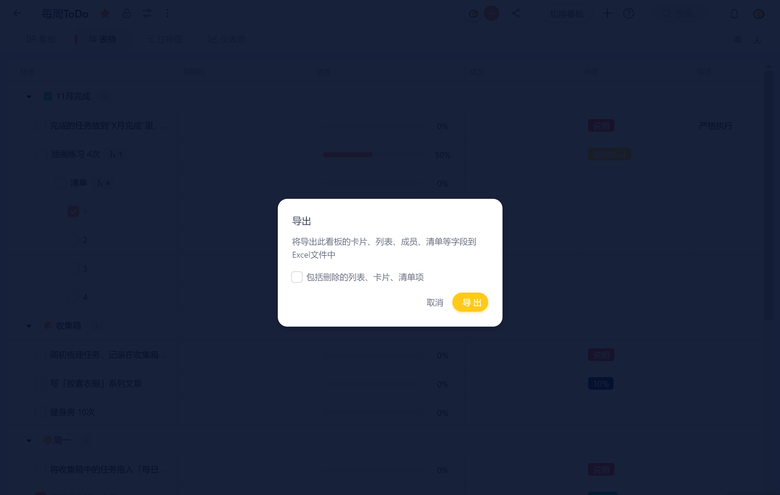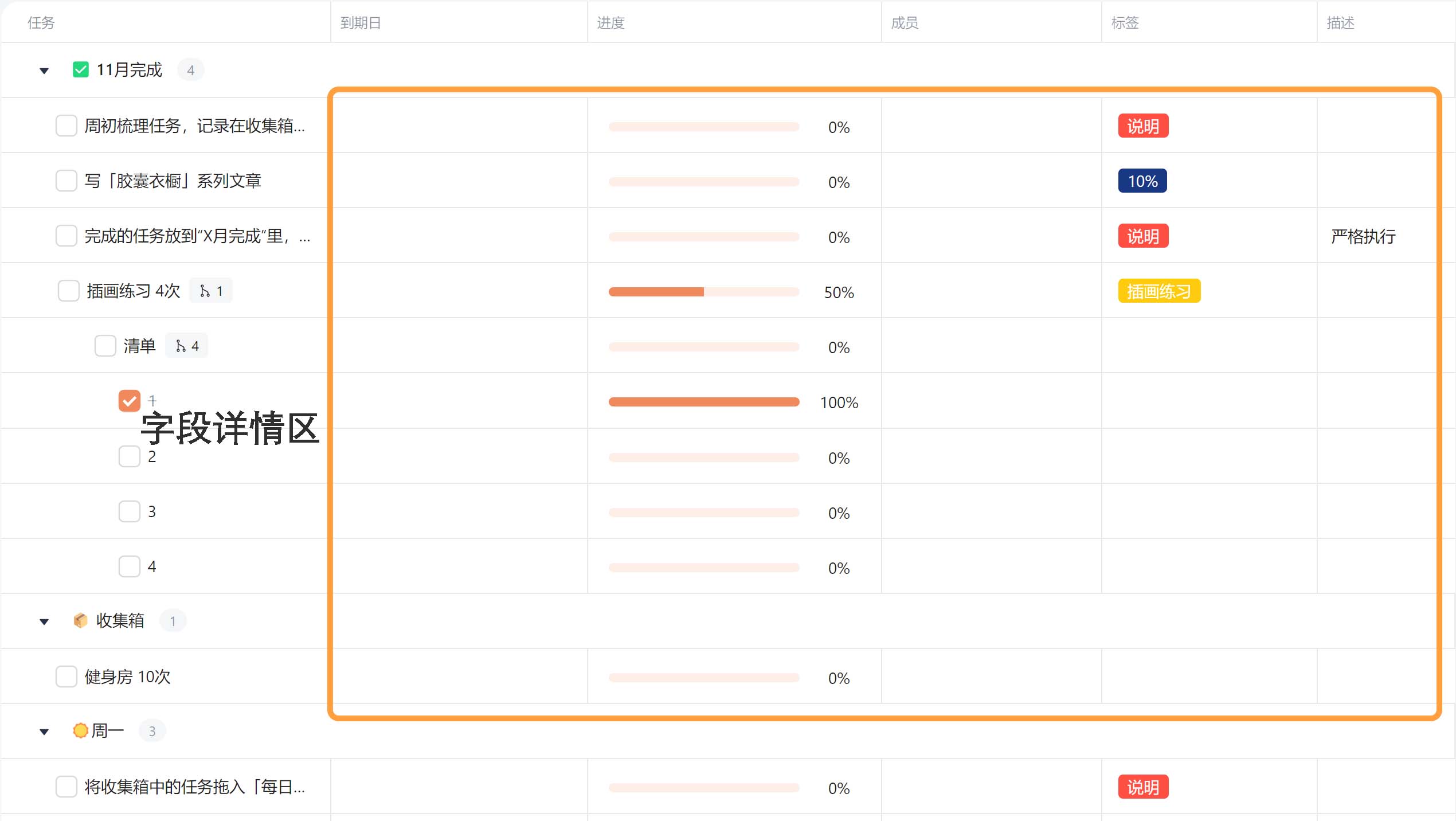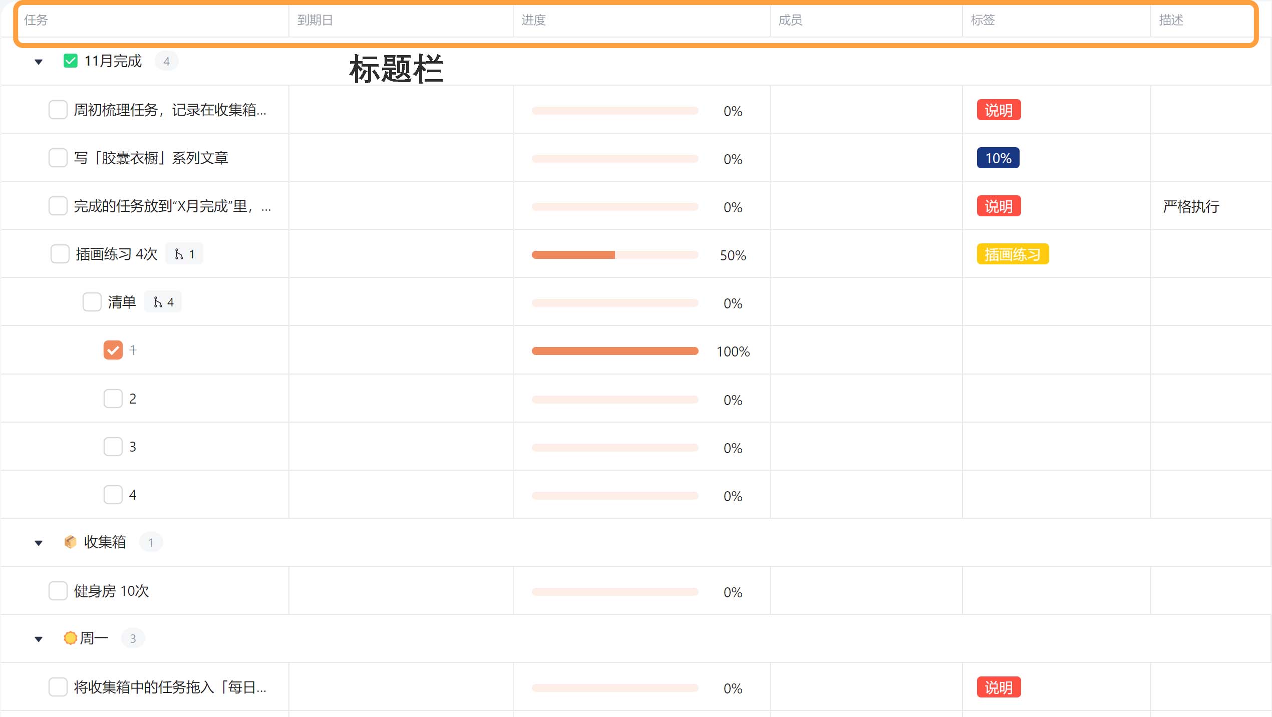 顶部为字段标题栏,同卡片详情中的字段内容一致,如到期日、进度、成员、标签等。字段标题无法修改,但可以移动顺序(除任务标题栏外)。