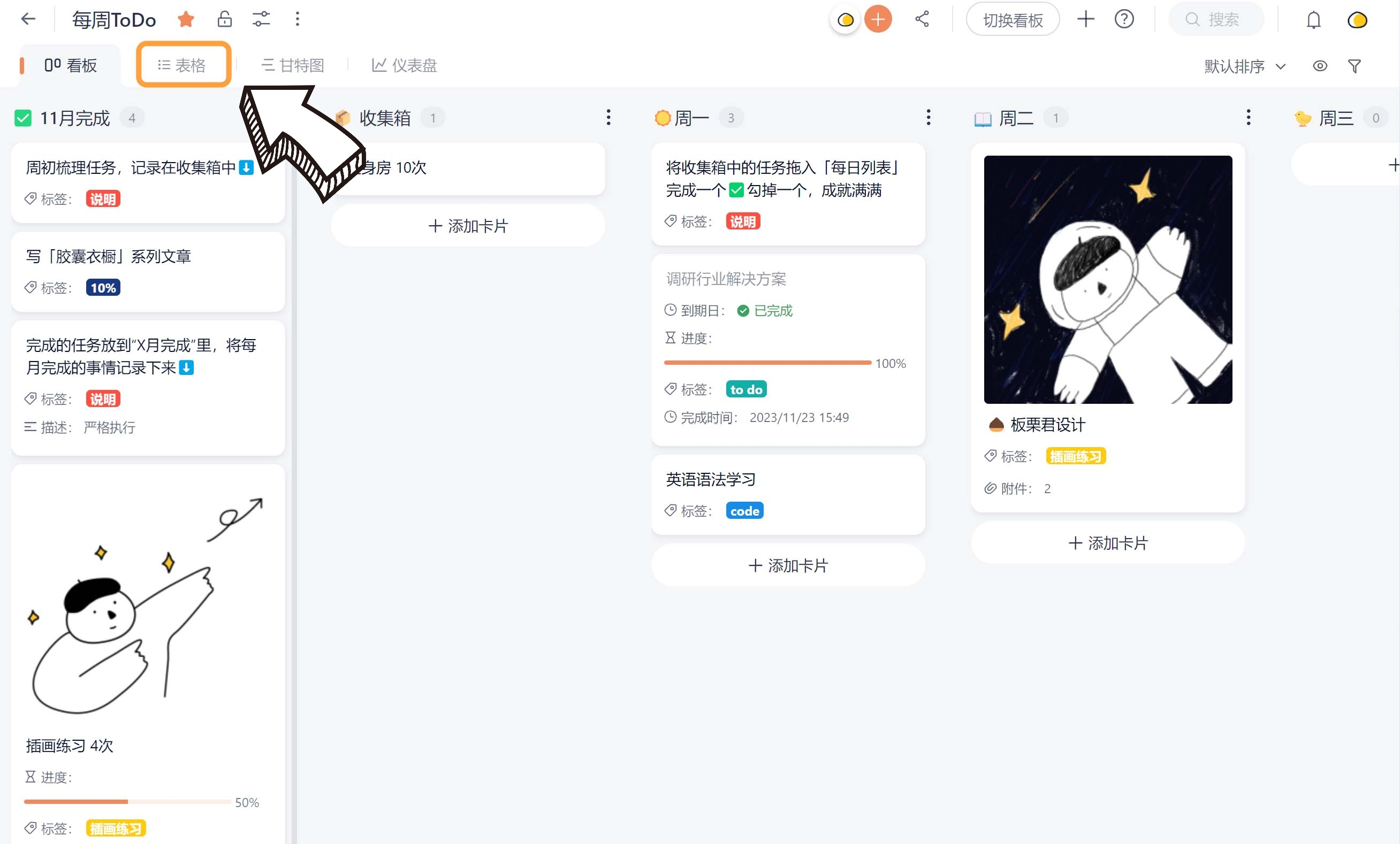 板栗看板能从“看板视图”,切换到“表格视图”,看板中所的列表、卡片、清单都能直接同步转化,帮助团队更快捷地查找过滤项目具体事项。