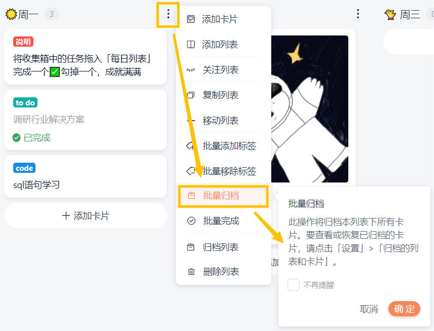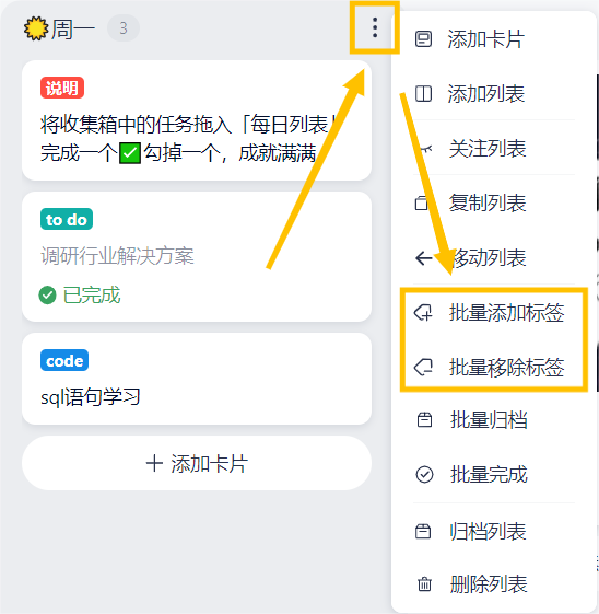 在电脑端,如果列表中的卡片太多,不方便通过拖拽方式移动卡片,也可以通过卡片快捷菜单将卡片直接移动到目标列表。支持跨看板移动(需是目标看板所属团队的团队成员)。