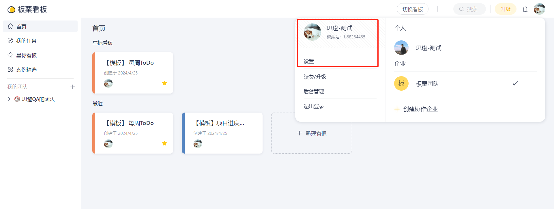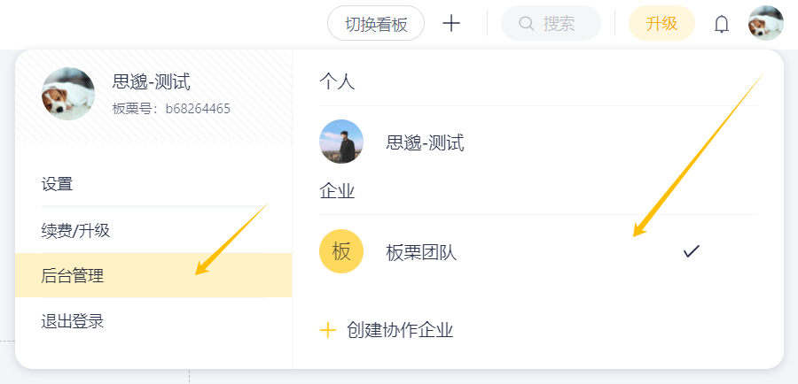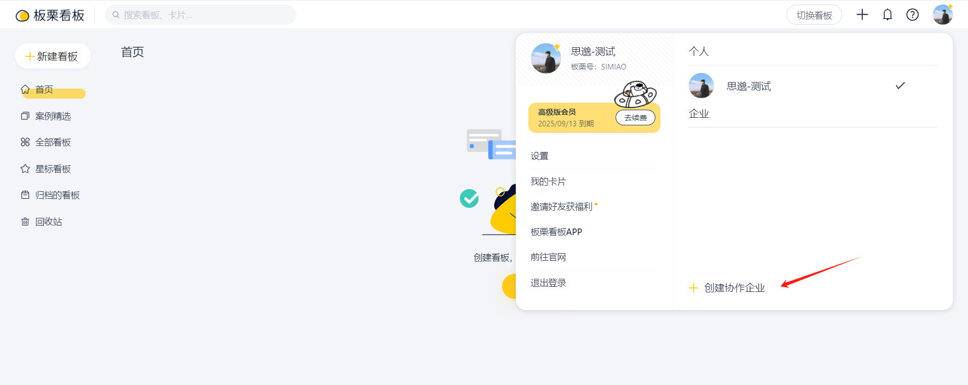 点击右上角头像,点击“创建协作企业”,输入企业名称并点击创建后,可切换至企业版。