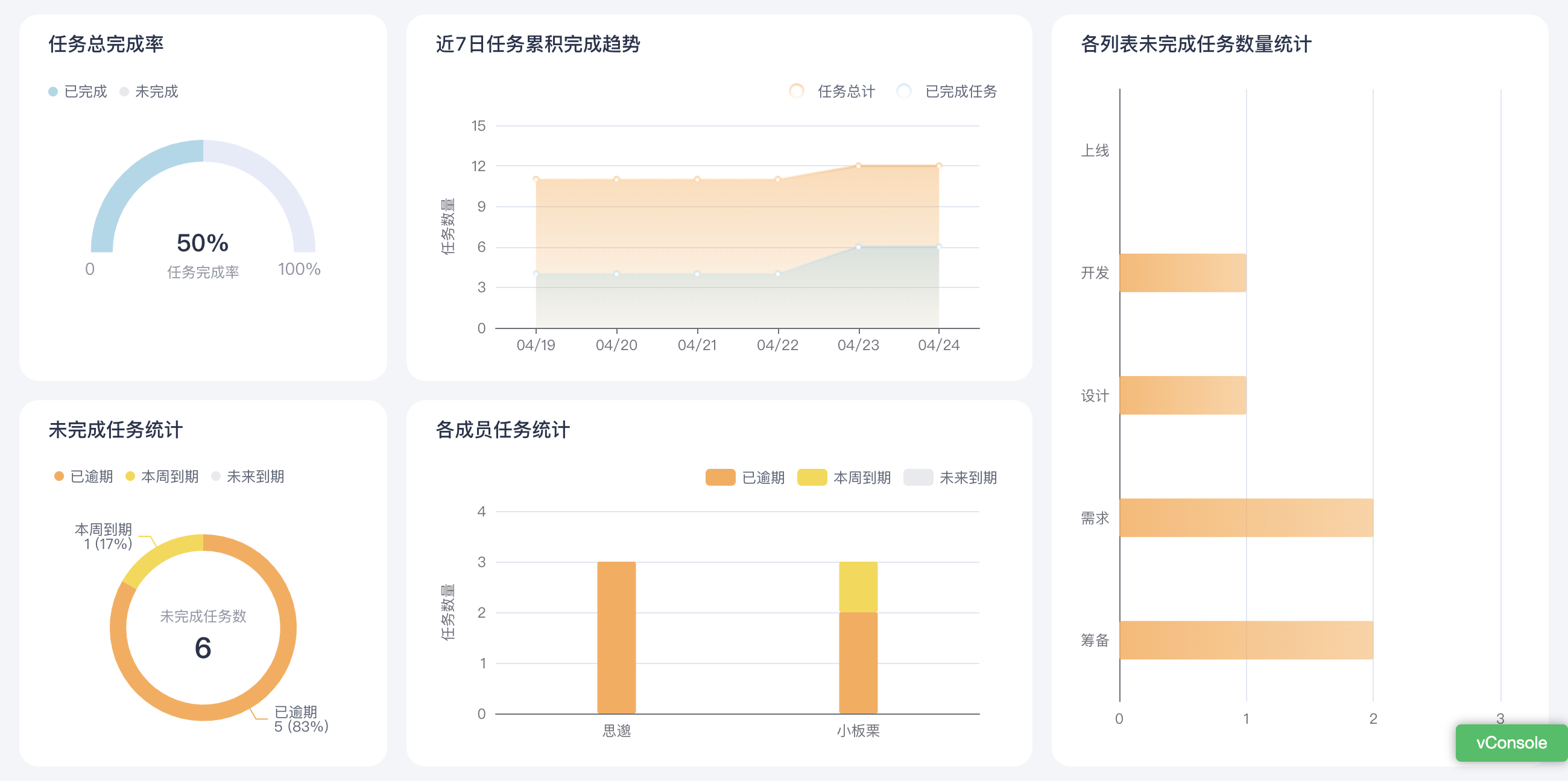 包括:已完成、进行中、即将到期和已逾期的任务数