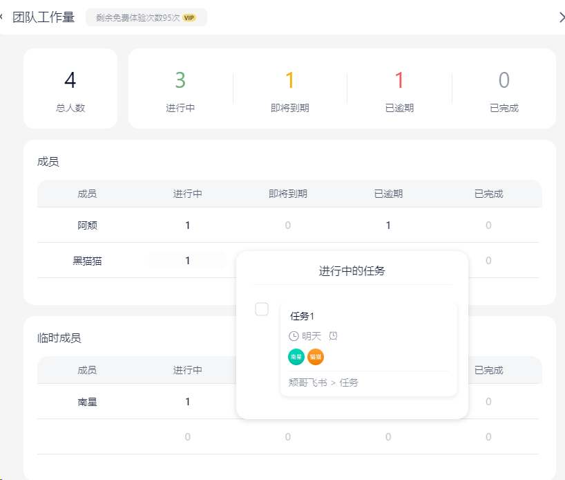 在首页右上角,可以点开“工作量统计”功能,从全局角度,查看每个团队成员的工作任务进展情况。