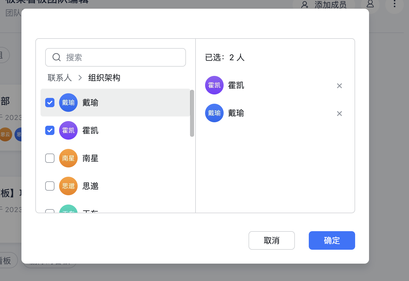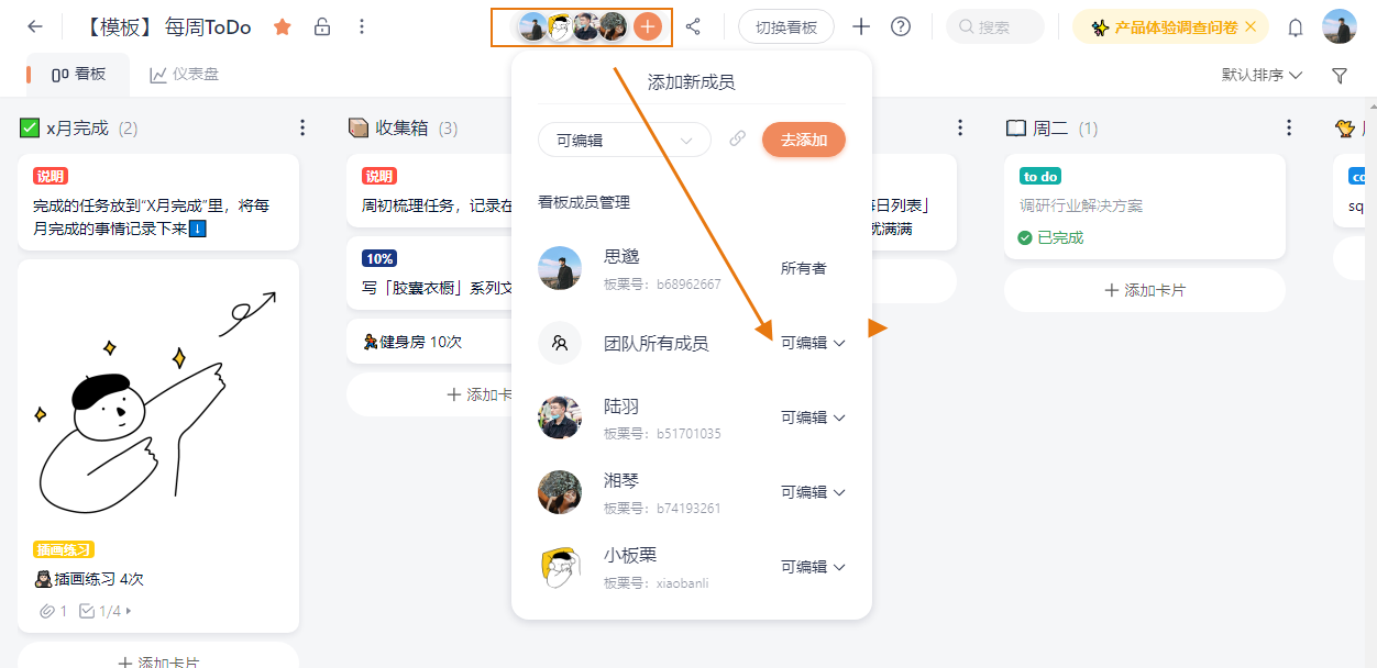此处添加的是团队成员,团队成员可查看和操作此团队中全部看板。若仅参与部分看板,可在相关看板中邀请看板成员