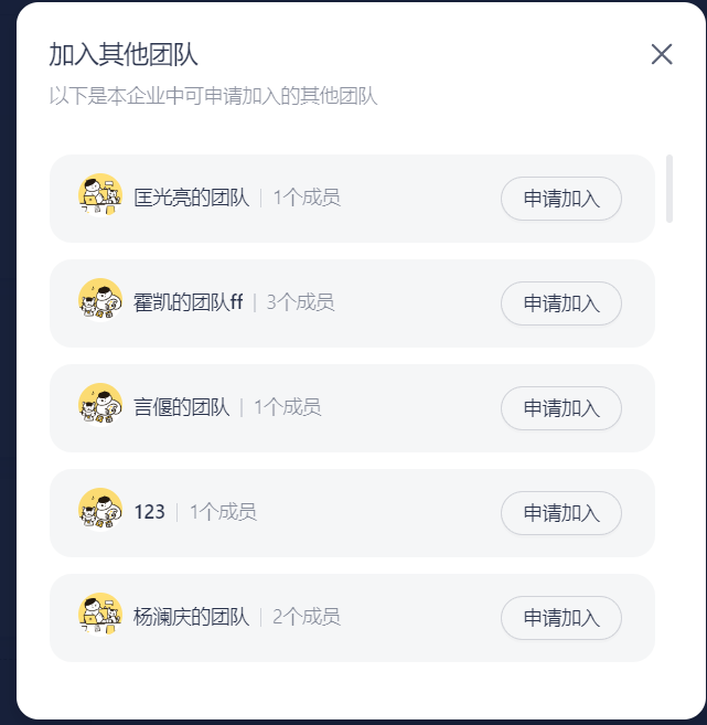 点击“团队”旁的 + 号按钮,选择“加入其它团队”可查看和申请加入同一个企业下的其他团队(需该团队的团队类型为“需申请加入”)。