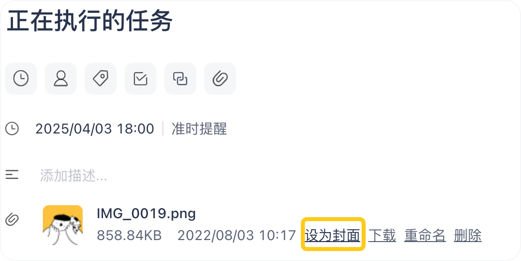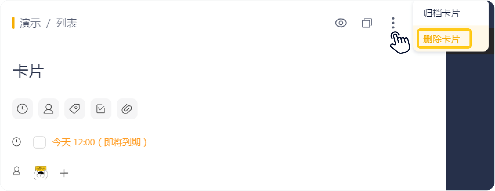 在卡片详情页里,点击右上角第一个图标,可关注当前卡片,接收该卡片的关键操作提醒(如:卡片删除、卡片拖动、到期日提醒、到期日完成等)。当设置为当前卡片的成员后,会将此成员设置为关注此卡片。