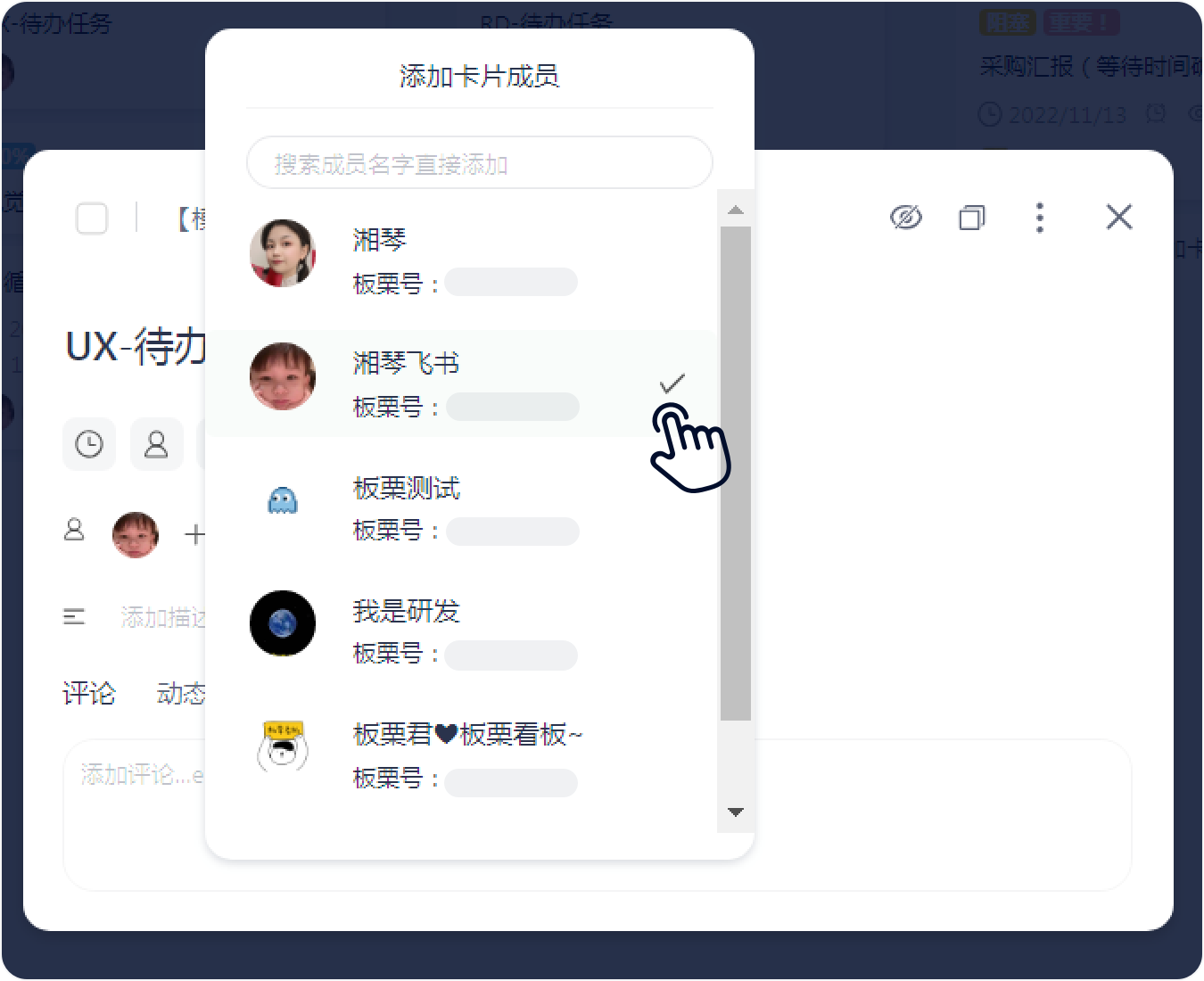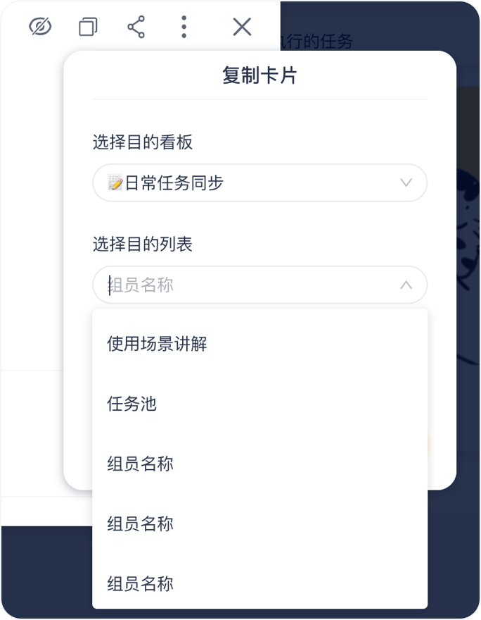 - 将卡片复制到其他看板时,仅保留卡片所有内容、卡片附件,不保留卡片成员。