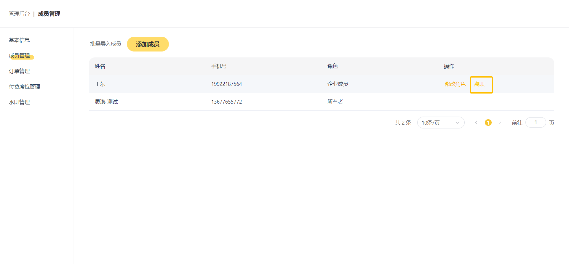 在成员管理中,企业的所有者(一般是创建人)可以自由进行企业成员的添加、离职,以及权限的修改。