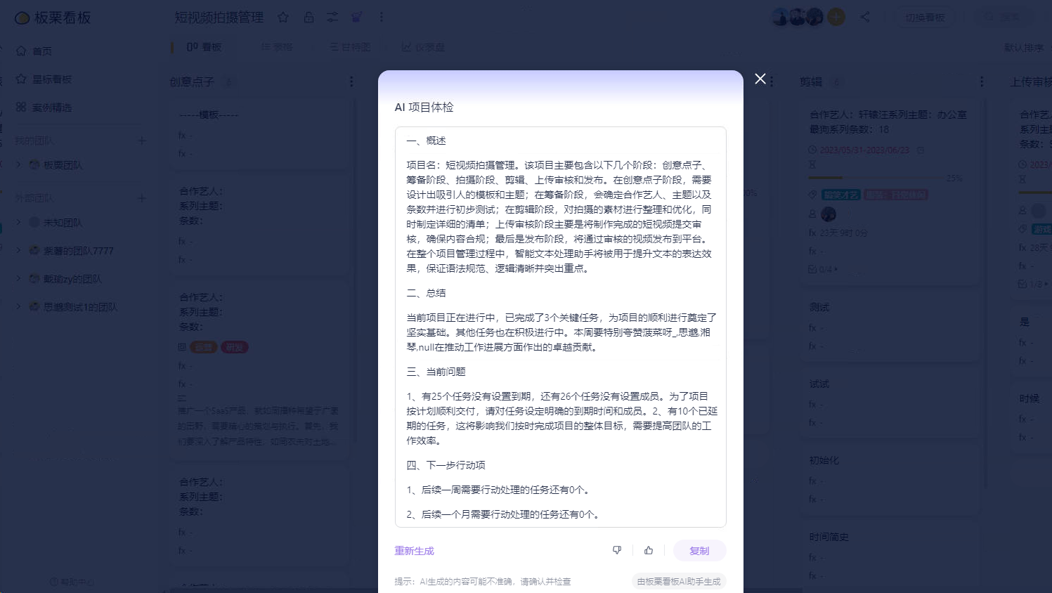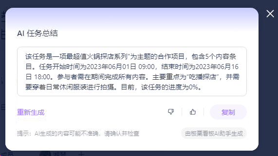 输入卡片重要数据,点击卡片详情中提供的 AI 入口即可 AI 生成任务总结。 AI 生成内容可复制,编辑,反馈,取消。