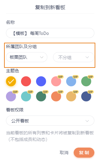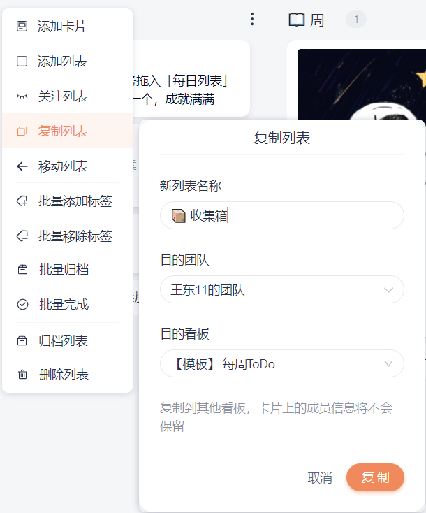 能将卡片复制到任一已加入的看板,以及该看板下的任一列表中。