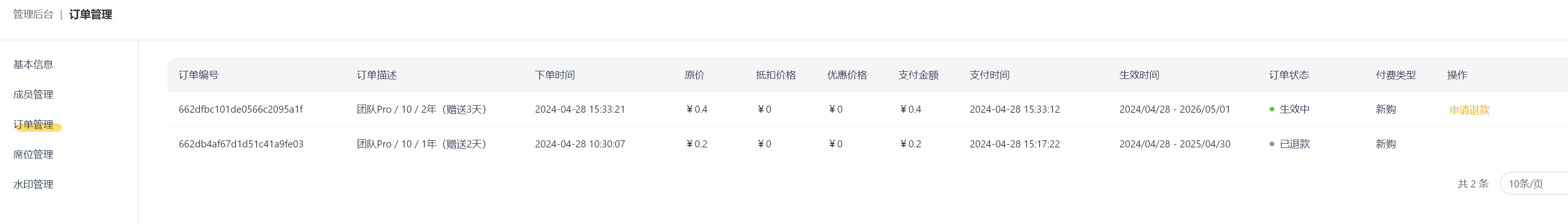 购买的付费订单将会记录到订单管理中,包括编号、规格、金额、购买和到期时间、生效状态、付费类型等信息。同时也可以在这里申请退款(仅购买 7 天内可申请,将一键退款)。