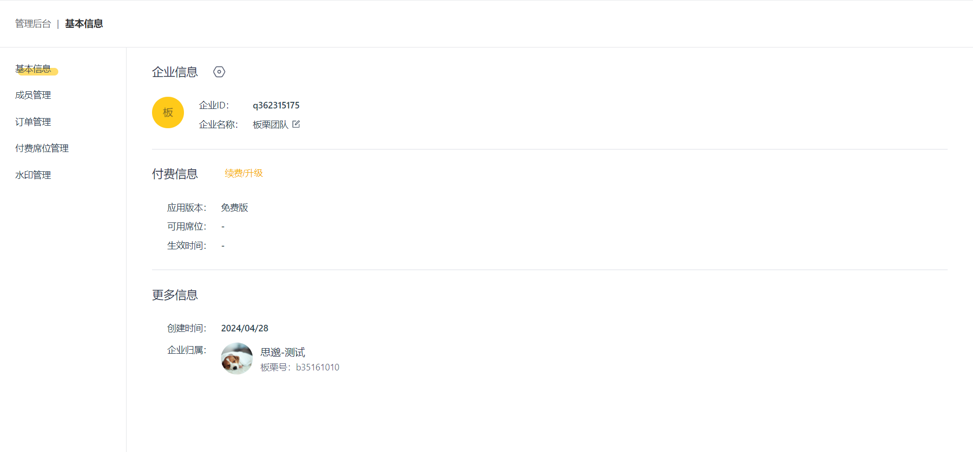 在这里可以看到企业 ID、企业名称;付费相关版本、席位、到期时间;以及企业的创建时间和所有者。其中只有企业名称可以随意修改。