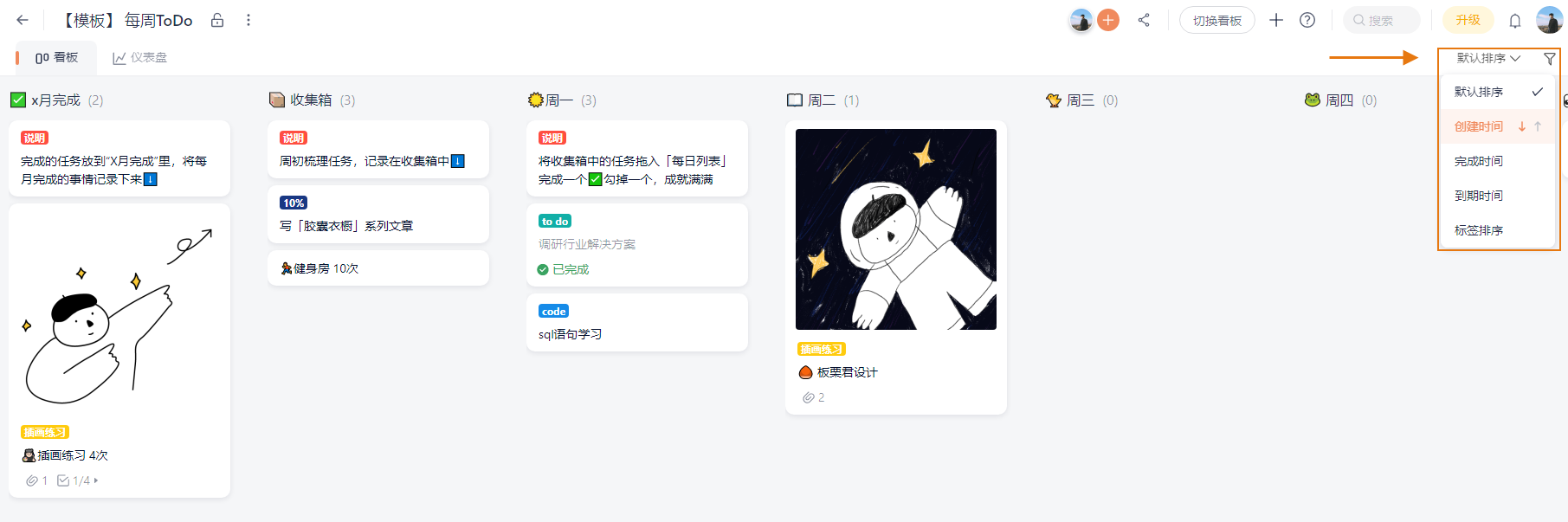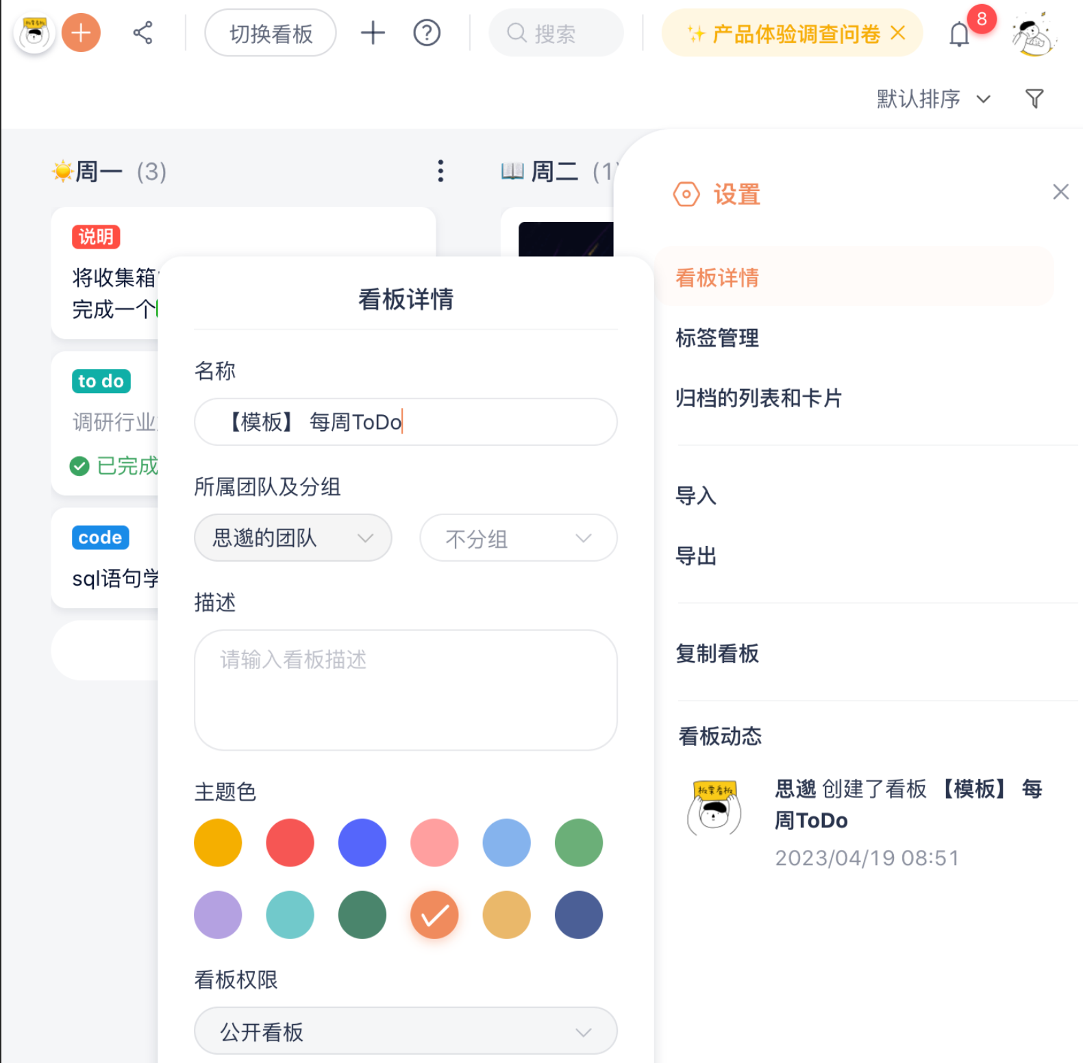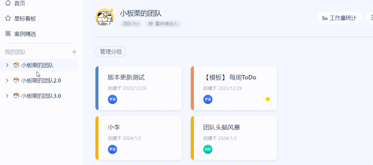 例如,有的看板与工作相关,可以归类到同一个分组,而有的则与生活相关,可以归类至另一个分组,分类管理可以使团队任务的呈现更加清晰明了。