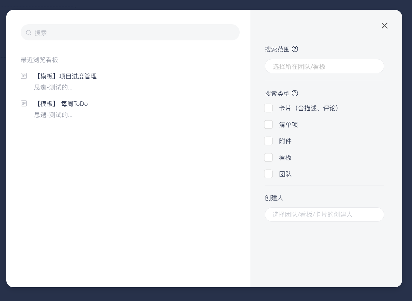 单击搜索框,打开搜索弹窗,通过输入目标内容的各项关键字,能够准确并且迅速地搜索加入应用的所有看板、卡片(包含已归档的看板与卡片)、卡片元素信息。