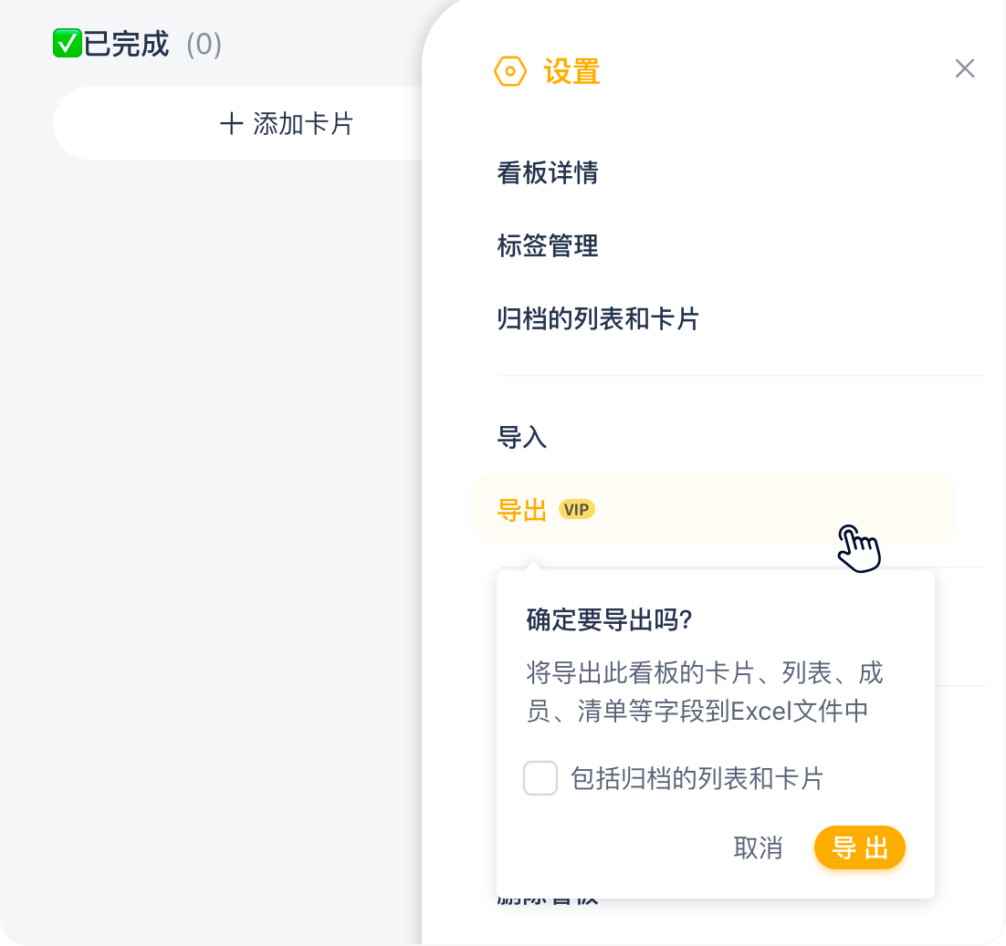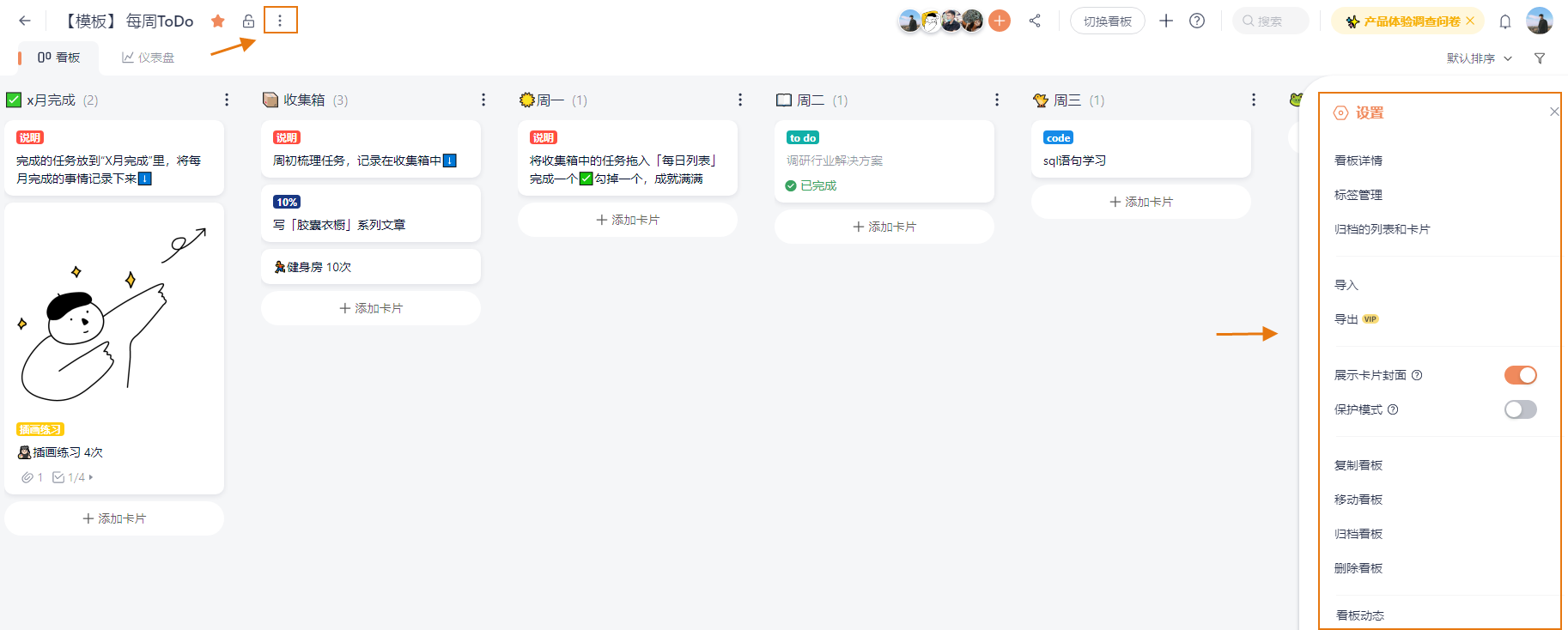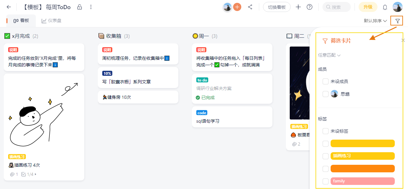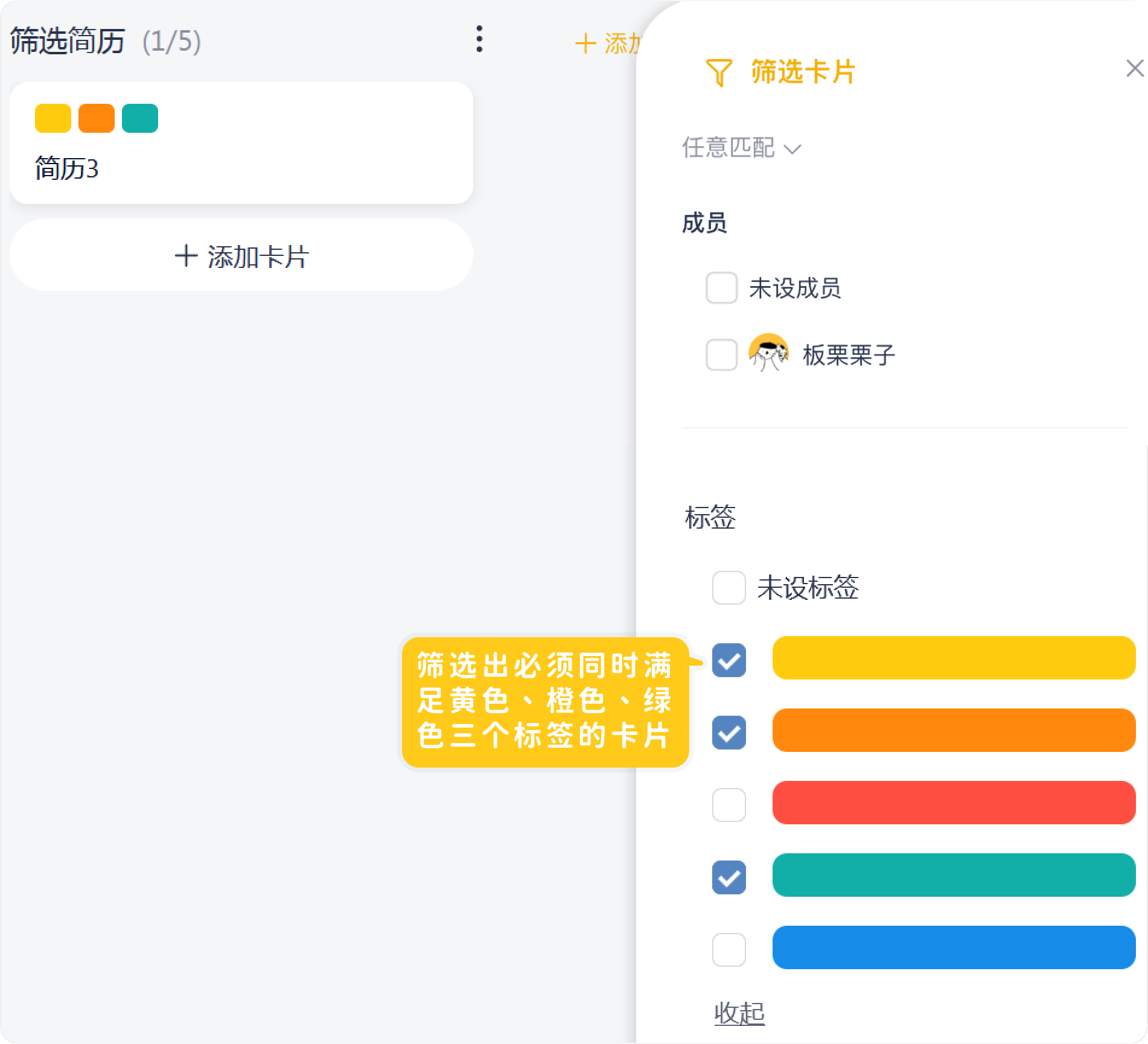 点击「筛选卡片」,可在看板中对成员、标签、到期时间、完成状态进行筛选。