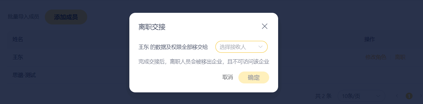 选择“离职”——可以将该成员所拥有/加入的看板及对应权限,移交给接收人。