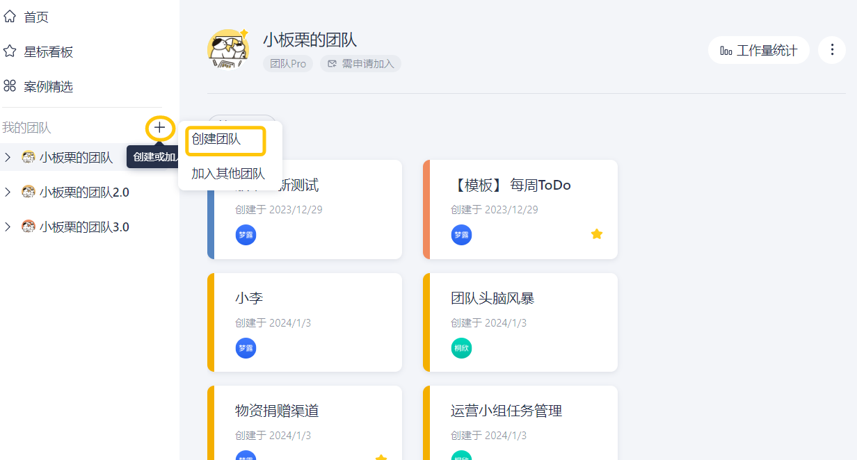 创建团队是进行协作的第一步。在板栗看板首页左侧,点击“团队”旁的 + 号按钮,选择“创建团队”即可新建团队。